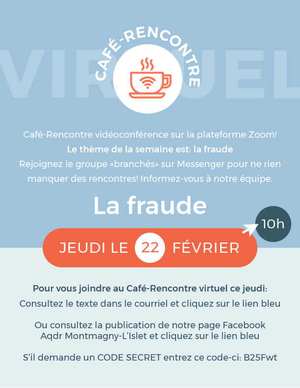 Le Café-rencontre vidéoconférence sur la plateforme Zoom portera sur la fraude. Voici ci-bas un lien cliquable en BLEU pour ouvrir la réunion Zoom.