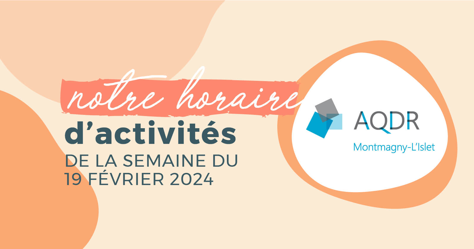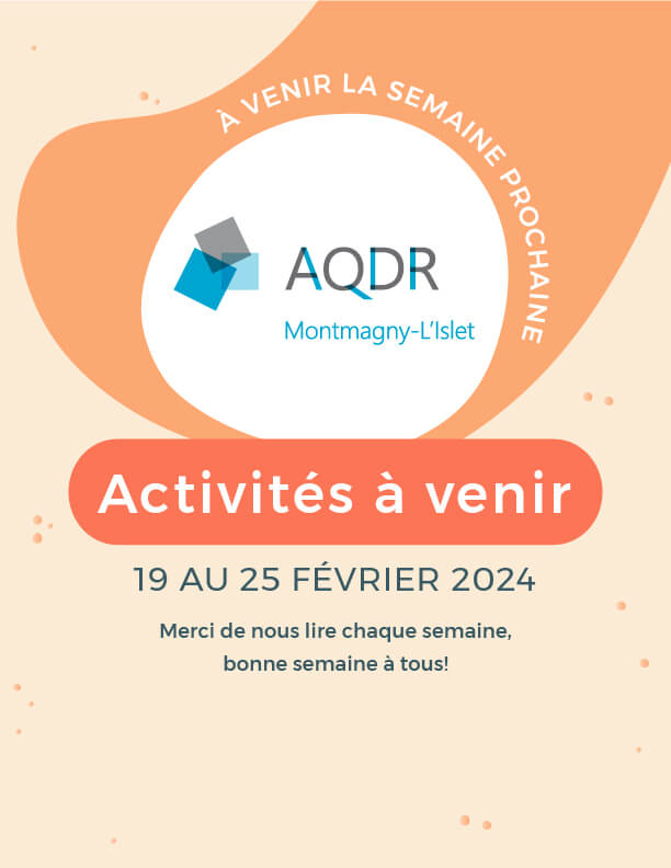 Voici les activités de l’AQDR proposées au cours de la semaine du 19 au 25 février 2024. Merci de bien vouloir prendre connaissance de notre programmation via le contenu ci-bas.