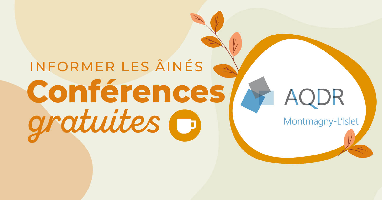 Série de conférences, activités, programmation automne 2025. Montmagny, L’Islet, Saint-Pamphile, Berthier-sur-Mer, Saint-Fabien-de-Panet, Sainte-Perpétue de l’AQDR Montmagny-L’Islet pour les aînés et personne retraitées et préretraitées de 50 ans et plus.