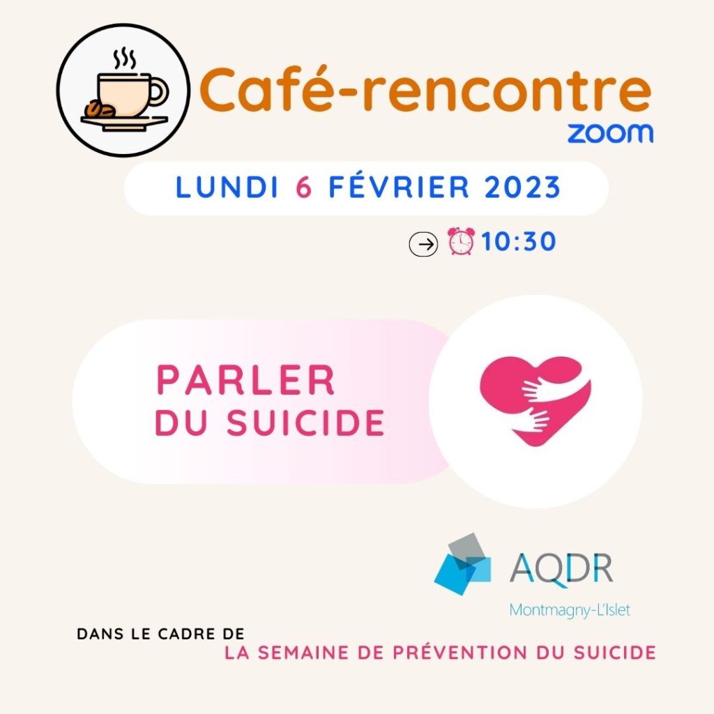 L’Association Québécoise pour la Défense des droits de la personne (AQDR) invite la communauté à se joindre au café-rencontre zoom ce lundi 6 février à 10h30. Cet événement se déroule dans le cadre de la semaine de la prévention du suicide (5 au 11 février 2023) et vise à sensibiliser et à informer sur les enjeux de santé mentale. Rejoignez-nous pour un temps de discussion afin d’ouvrir le dialogue sur un sujet encore tabou. Ensemble, nous pouvons faire une différence positive.