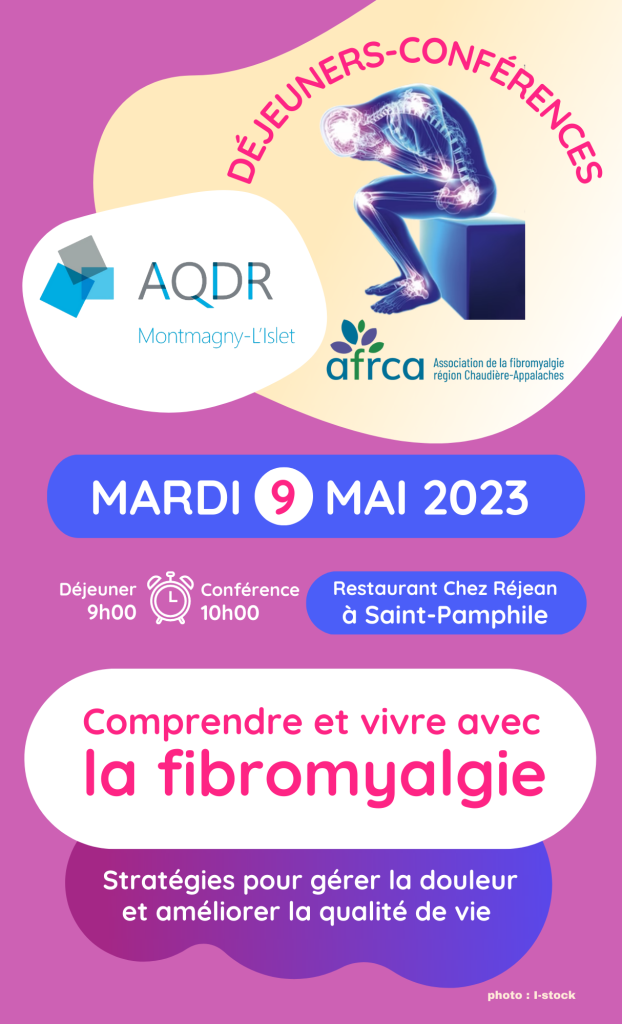 Le mardi 9 mai 2023, François Gagnon de l’Association de la Fibromyalgie Région Chaudière-Appalaches (AFRCA) offrira une conférence au restaurant Chez Réjean à Saint-Pamphile. Le public aura l’opportunité d’obtenir des informations essentielles sur la manière de comprendre et de vivre avec la maladie. Lors de cette présentation, l’intervenant partagera avec le public des stratégies pour gérer la douleur et améliorer la qualité de vie.