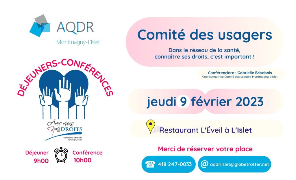 Venez assister à la prochaine conférence en collaboration avec le Comité des usagers de Montmagny-L’Islet. Le Comité des usagers a pour mandat de faire connaitre les droits des usagers et de les défendre. Pour en apprendre davantage sur vos droits en matière de santé, nous vous donnons rendez-vous :