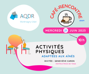 Notre prochain café-rencontre Zoom abordera le thème des activités physiques adaptées aux aînés, avec la présence de Geneviève Caron, instructrice de Yoga. Découvrez comment rester actif et en forme tout en prenant soin de vous. Un moment inspirant à ne pas manquer !