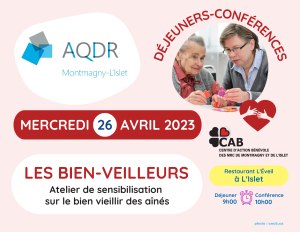 Le mercredi 26 avril, Steeve Gobeil, travailleur de milieu au Centre d’Action bénévole de la MRC Montmagny et la MRC L’Islet, offrira “les Bien-veilleurs”, un atelier-conférence de sensibilisation sur le bien vieillir des aînés.