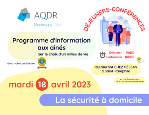 Le mardi 18 avril, Marie-Joëlle Girard de la Sûreté du Québec donnera une conférence sur la sécurité à domicile dans le but de sensibiliser les participants aux enjeux de sécurité actuels et de leur fournir des informations pratiques pour se protéger.